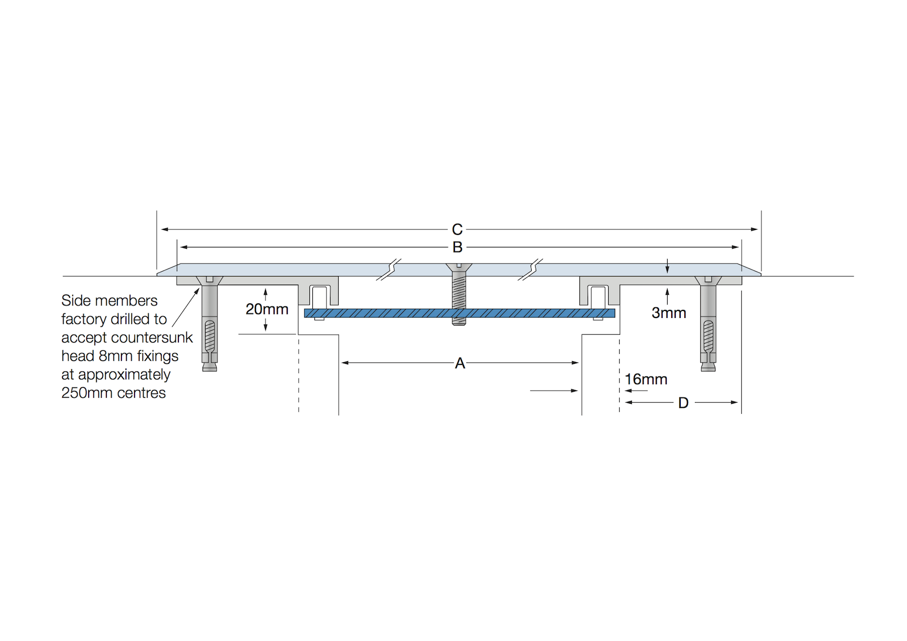 Stainless Steel Code | A | B | C | D | E | F | G | H | Movement | Total Available Movement | Cover Plate Thickness | Countersunk Head Fixings per 350mm centre | |